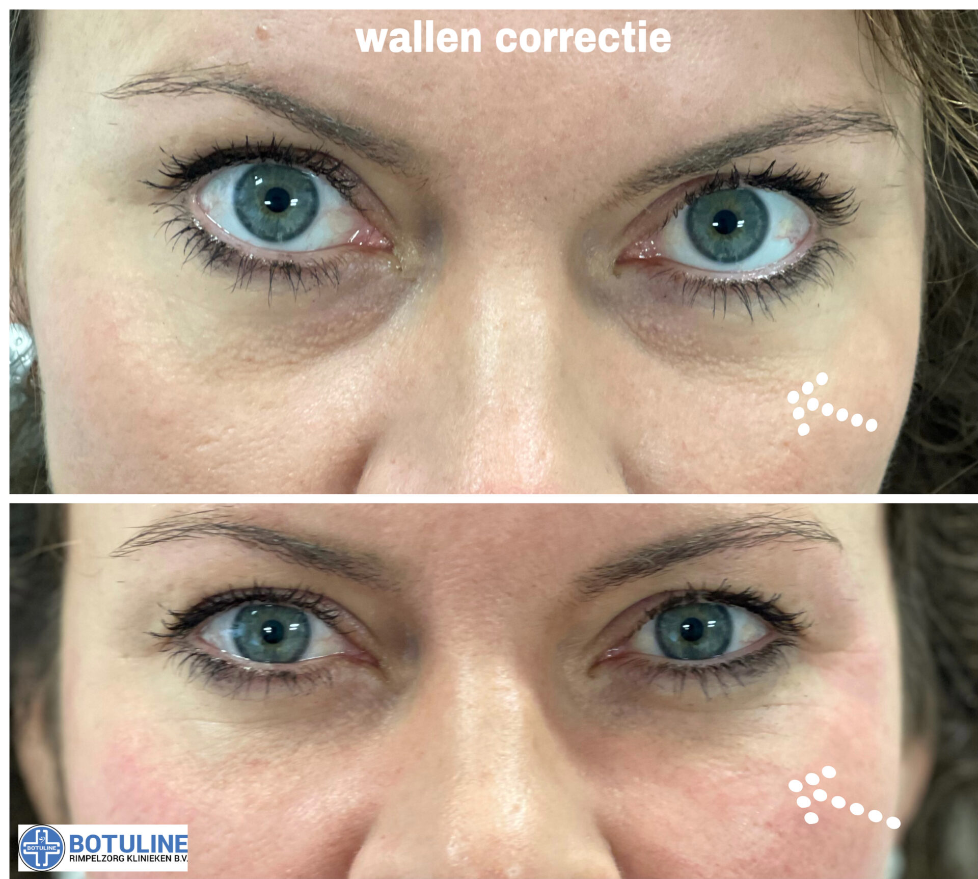Wallen onder de ogen ontstaan vaak door een volumetekort in de huid. Bij Botuline Rimpelzorg Klinieken B.V. gebruiken we voor het verwijderen van wallen een hyaluronzuur filler. Dit is een lichaamseigen stof. Met onze verfijnde injectietechniek spuiten wij de filler in, waardoor het volumetekort meteen wordt hersteld. De contouren van de wangen naar de ogen verlopen weer geleidelijk, en van wallen is nu niets meer te zien. Het grote voordeel van een hyaluronzuur filler behandeling tegen wallen onder de ogen is dat je meteen resultaat ziet, en dat dit resultaat wel 1,5 tot 2 jaar zichtbaar blijft, tot het vanzelf door het lichaam wordt afgebroken. Wij spuiten de filler door middel van enkele kleine prikjes in. Door onze verfijnde injectietechniek zijn deze prikjes nagenoeg pijnloos. Maar als u wilt, kunnen wij uw huid voor de behandeling eerst verdoven.